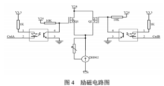 勵(lì)磁電路決定儀表的工作磁場(chǎng),是儀表極其關(guān)鍵的部分。本文中的勵(lì)磁電路由兩部分組成,如圖4所示。由單片機(jī)MSP430F2418的定時(shí)器產(chǎn)生雙頻矩形波,經(jīng)光耦隔離后通過兩片場(chǎng)效應(yīng)管組成的開關(guān)電路實(shí)現(xiàn)通斷功能。DH902為恒流管,提供恒定的勵(lì)磁電流,由MCU定時(shí)器脈沖寬度調(diào)制(PWM)輸出經(jīng)過濾波后控制勵(lì)磁電流的幅值,從而產(chǎn)生雙頻矩形波。
