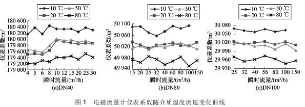 (1) 隨著介質(zhì)溫度的升高,耐腐蝕排污管道流量計的儀表系數(shù)均呈逐漸降低的趨勢。其中20℃和50℃的儀表系數(shù)基本相同,10℃和80℃的儀表系數(shù)與20℃時偏離較大。