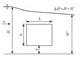 有限水域的浮體結(jié)構(gòu)在不同來流動水中運(yùn)行時,浮體結(jié)構(gòu)位置的改變會對流場產(chǎn)生影響,從而影響浮體結(jié)構(gòu)的泄流能力以及穩(wěn)定性。試驗過程中固定浮體結(jié)構(gòu)的體型不變(長L=0.20m,寬B=0.30m,高a=0.10m),分別選取4種不同來流流量Q及浮體結(jié)構(gòu)位置e,控制浮體結(jié)構(gòu)在上、下游水位不變的條件下進(jìn)行試驗,具體試驗參數(shù)設(shè)計及說明見表1以及圖2。
