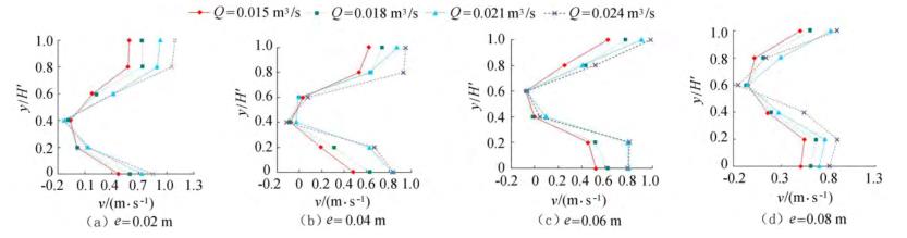 圖4橫坐標(biāo)為斷面水流方向流速,縱坐標(biāo)為測點(diǎn)垂向位置與下游水位的比值y/H'。隨著浮體結(jié)構(gòu)位置的上升,*小斷面流速位置同樣上升。以圖3(a)為例,當(dāng)e=0.02m時,下游斷面位置自下而上呈現(xiàn)先減小、后增大的趨勢,在y/H'=0.40時流速達(dá)到*小,隨著浮體結(jié)構(gòu)位置的上升,*小流速呈現(xiàn)向上偏移的趨勢。在斷面位置y/H'=0.20時,隨著e的增大,流速呈現(xiàn)增大的趨勢。當(dāng)e較小時,流經(jīng)浮體結(jié)構(gòu)下部進(jìn)行下泄的水流較少,主流出現(xiàn)在浮體結(jié)構(gòu)的上部,且在浮體結(jié)構(gòu)的阻擋作用下出現(xiàn)回流區(qū);隨著e上升,主流偏向浮體結(jié)構(gòu)下部區(qū)域,流速增大。與y/H'=0.20的流速分布正好相反,當(dāng)y/H'=0.80時,流速分布隨著浮體位置的增大而減小。隨著e的增大,通過浮體結(jié)構(gòu)下部泄流的水體增多,主流開始向下偏移。試驗過程中,浮體結(jié)構(gòu)處于淹沒狀態(tài),流速的分布隨著浮體位置的改變呈現(xiàn)上大、中小、下大的分布趨勢,在浮體結(jié)構(gòu)下游區(qū)域形成回流區(qū),回流區(qū)的位置隨著浮體結(jié)構(gòu)的上升而上升。