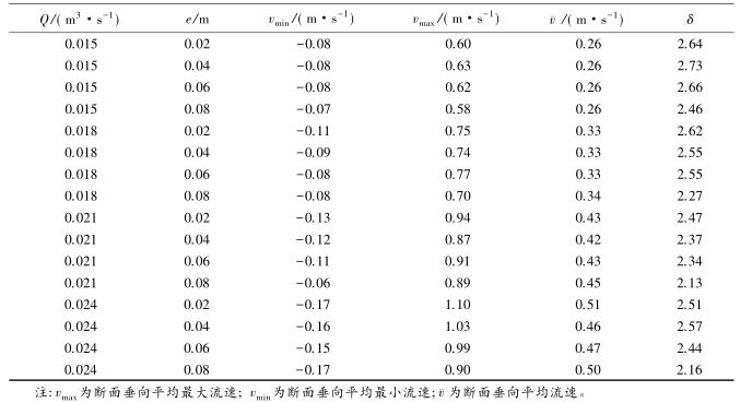 流速沿斷面分布的均勻特性可以通過流速分布不均勻系數(shù)進(jìn)行表征,通過所選取斷面*大流速和*小流速的差值與該斷面平均流速的比值,δ值越大表明浮體結(jié)構(gòu)的存在對水流斷面流速的分布產(chǎn)生的影響較大。表2中,當(dāng)來流流量相同時,流速的不均勻系數(shù)多數(shù)隨e的增大而減小。浮體結(jié)構(gòu)位置較小時,主流為浮體結(jié)構(gòu)上部的水流。隨著浮體結(jié)構(gòu)位置的上升,來自上游的水體逐漸分成浮體結(jié)構(gòu)上部和下部的兩股主流,流速分布的不均性減小。浮體結(jié)構(gòu)位置及所處水位條件相同時,來流流量的增大,區(qū)域的平均流速增大,因此流速不均勻性減小。