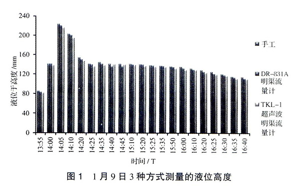 見圖3,以手工實測液位高度為基準,2種流量計的誤差均在±5%的范圍內(nèi)。除在1月9日14∶40和14∶45兩個時間點測量值表現(xiàn)出DR-831A測量誤差高于TKL-Ⅰ外,其他時段都明顯表現(xiàn)出DR-831A測量誤差小于TKL-Ⅰ。