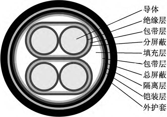 該新型電纜的結(jié)構(gòu)如圖1所示。導(dǎo)體為單股退火鍍錫軟銅線,以提高導(dǎo)體的導(dǎo)電性和防腐蝕性。在導(dǎo)體外繞包一層薄F4(聚四氟乙烯)半導(dǎo)電帶,有利于降低導(dǎo)體和絕緣之間的摩擦起電噪音。絕緣采用材料較為純凈、介電常數(shù)較小、具有一定彈性的聚丙烯絕緣級(jí)材料,并采用擠壓式擠出,減小絕緣層與導(dǎo)體的間隙。采用對(duì)絞組作為信號(hào)傳輸線,由于在兩根傳輸線上感應(yīng)的電壓接近相等,減小了電壓差值,提高了信號(hào)傳輸穩(wěn)定性;對(duì)絞組由兩種不同顏色絕緣線芯組成,相鄰線對(duì)對(duì)絞節(jié)距應(yīng)不大于100mm。對(duì)絞分屏蔽組(即對(duì)對(duì)絞組進(jìn)行分屏蔽,每對(duì)對(duì)絞組外繞包兩層聚酯帶和一層厚0.04mm鋁塑復(fù)合帶繞包,內(nèi)置一根7×0.26mm鍍錫銅絞線作引流線)有利于對(duì)不同對(duì)絞組之間信號(hào)串音的抑制和隔離。對(duì)絞分屏蔽組同心式絞合成纜,在對(duì)絞分屏蔽組間填充非吸濕性材料,以保證纜芯圓整。在成纜纜芯外繞包兩層聚酯帶,再采用鋁塑復(fù)合帶繞包,內(nèi)置鍍錫銅線作引流線,以提高電纜電磁屏蔽能力??偲帘螌油鈹D包隔離層(隔離護(hù)套),隔離層采用絕緣級(jí)低密度聚乙烯材料。隔離層外采用鎧裝層,鎧裝材料為高導(dǎo)磁合金鋼帶,其為強(qiáng)磁材料,可將外來的磁通大部分限制在鎧裝層的外表面上(僅有少部分能進(jìn)入被屏蔽的空間);鎧裝時(shí)對(duì)高導(dǎo)磁合金鋼帶采用縱包焊接,確保其形成一連續(xù)圓柱管;鎧裝層可提高電纜抗電磁干擾水平以及對(duì)電纜進(jìn)行加強(qiáng),減少電纜振動(dòng)引起的電動(dòng)勢(shì)。外護(hù)套采用藍(lán)色軟PVC(聚氯乙烯)護(hù)層級(jí)電纜材料擠包,實(shí)現(xiàn)電纜防護(hù)。
