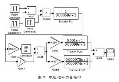 本文基于 Matlab 中 Siumlink 對電極信號進(jìn)行仿真,勵磁方式為三值波勵磁,勵磁頻率 f=25Hz,傳感器參數(shù) D=40mm、Rx=88.8Ω、Lx=162mH,勵磁系統(tǒng)參數(shù) Ue=100V、穩(wěn)態(tài)電流 I0=200mA?;陔姌O測量回路搭建的仿真模型如圖 2 所示,圖中信號模塊 pulsGenerator 通過加法器、乘法器得到勵磁電流。由公式(1),在固定流速下感應(yīng)電勢與勵磁電流成正比,通過增加 Gain1 模塊得到感應(yīng)電勢信號。 對勵磁電流進(jìn)行求導(dǎo)即經(jīng)模塊 Derivative 得到微分噪聲, 其中 Gain 值與 Lx 和 L1 相關(guān)。 感應(yīng)電勢與噪聲經(jīng)Add1 疊加之后得到電極信號 E1(t)。 scope 觀察輸出信號波形。仿真波形和真實波形如圖 3 所示。 將傳感器參數(shù)代入到勵磁電流穩(wěn)態(tài)調(diào)節(jié)時間公式中,得電流上升時間為 360μs,測得實際上升時間為 390μs,兩者相差不大,驗證了仿真模型的正確性。