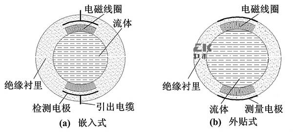 電極與被測(cè)流體通過(guò)絕緣管形成檢測(cè)電容,通過(guò)此電容來(lái)藕合流量信號(hào)。其主要的結(jié)構(gòu)形式按照電極的安裝位置可以分為兩種:電極嵌人測(cè)量管的絕緣襯里內(nèi)部(嵌人式)、電極貼在測(cè)量管外部(外貼式)。嵌入式結(jié)構(gòu)與普通一寸管污水流量計(jì)結(jié)構(gòu)相似,而外貼式大多是通過(guò)陶瓷表面金屬化技術(shù)將電極貼在測(cè)量管外。