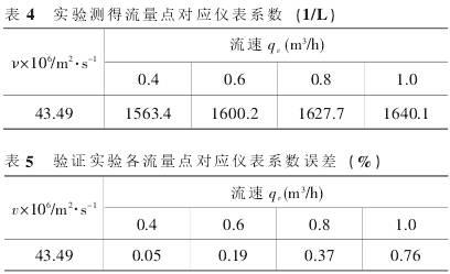 為證明該高粘度變流速自適應算法及公式的有效性,重新選取四個流量點:0.4m3/h、0.6m3/h、0.8m3/h、1.0m3/h對該公式以及算法進行精度驗證,得到表4數(shù)據(jù),表5為各對應流量點的擬合后儀表系數(shù)的誤差。