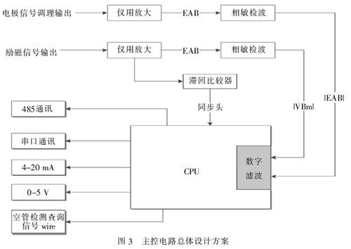 考慮到傳感器出來的微弱信號(hào)容易在傳輸線上損耗,故而電極信號(hào)調(diào)理板和空管檢測(cè)功能板就近放置于傳感器出線口,調(diào)理后經(jīng)屏蔽線傳輸至轉(zhuǎn)換器上的主控電路。