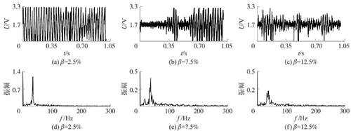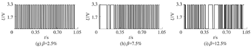 試驗發(fā)現(xiàn),氣相的加入對乙烯流量計測量的影響顯著,譜分析和脈沖計數(shù)兩種方法隨著氣相注入的增加其表現(xiàn)也不同。圖4反映了水流量12m3/h時,注入不同氣含率β時A點的模擬信號,如圖4(a~c)所示;經(jīng)譜分析后得到的頻率值,如圖4(d~f)所示;用脈沖計數(shù)方法得到的脈沖信號,如圖4(g~i)所示。圖4顯示,當(dāng)注入氣量不大時,對乙烯流量計的影響不大,無論是譜分析結(jié)果還是脈沖計數(shù)得到的結(jié)果都比較好。當(dāng)注入的氣量進(jìn)一步增加時,渦街原始信號強度和穩(wěn)定性逐漸變差,渦街頻率信號會被干擾信號所淹沒,反映到譜分析圖是,渦街頻率的譜能量減小,干擾信號的譜能量加強;對于脈沖信號,會因為一些旋渦信號減弱,形成脈沖缺失現(xiàn)象,而不能真實地反映渦街產(chǎn)生的頻率。