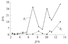 將試驗數(shù)據(jù)進(jìn)行處理,得到了乙烯流量計測量誤差隨氣相含率變化的情況,如圖5所示。其中δs為譜分析方法的測量誤差,δc為脈沖計數(shù)方法的測量誤差。乙烯流量計的測量誤差用式(4)來計算。其中Qs為裝置中標(biāo)準(zhǔn)表測量出的管道總流量,Qt為試驗管段中乙烯流量計的測量值。將譜分析和脈沖計數(shù)得到的頻率值和儀表系數(shù)分別代入式(5)計算Qt值。從圖中可以看出氣相含率的增加兩種測量方法得到的誤差并不相同。當(dāng)含氣率不高時,0<β<6%,譜分析法的平均誤差為1.226%,*大誤差為2.687%,脈沖計數(shù)法的平均誤差為1.583%,*大誤差為2.898%,因此譜分析法與脈沖計數(shù)法的測量誤差區(qū)別不大,譜分析沒有明顯的優(yōu)勢;在氣相含率進(jìn)一步增加時,6%<β<14%,譜分析法的平均誤差為3.975%,*大誤差為14.058%,脈沖計數(shù)法的平均誤差為20.053%,*大誤差為33.130%,脈沖計數(shù)的方法得到的測量誤差遠(yuǎn)大于譜分析方法。