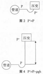 建議采用圖2的安裝方式,如不得已需要選擇圖3、圖4的安裝方式一定要對(duì)壓力進(jìn)行補(bǔ)償。不建議按照?qǐng)D5的方式安裝,因?yàn)闊o法確定P'與P的關(guān)系。