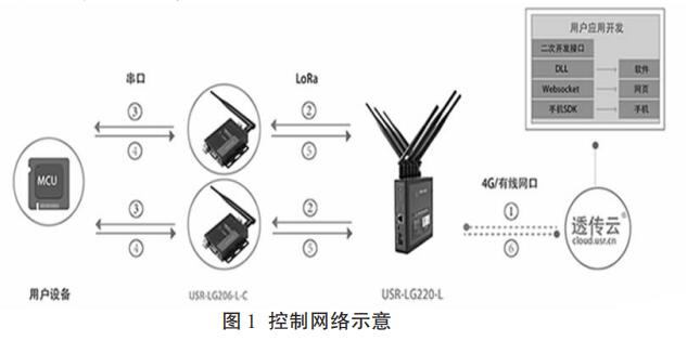 基于 LoRa 技術(shù)的無線流量計(jì)由控制,計(jì)量,通信,電源,存儲(chǔ)五個(gè)模塊組成。以液體流量計(jì)為主體的計(jì)量模塊將采集到的供暖管道數(shù)據(jù)發(fā)送到通信模塊,基于 LoRa 技術(shù)的通信模塊將流量數(shù)據(jù)存儲(chǔ)并且發(fā)送到由管理人員監(jiān)控的控制模塊,管理人員通過控制模塊和通信模塊向流量計(jì)發(fā)送指示。電源模塊是無線流量計(jì)的能源中心,可以為流量計(jì)的其他模塊提供動(dòng)力支持。流量計(jì)安裝完畢后可在小區(qū)內(nèi)形成控制網(wǎng)絡(luò),網(wǎng)絡(luò)示意圖如圖 1 所示。