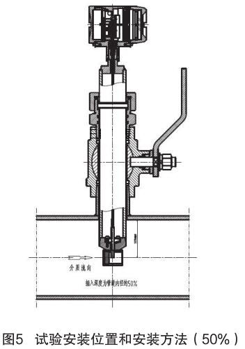 對插入式煙氣流量計(jì)和插入式電磁流量計(jì)的結(jié)構(gòu)原理進(jìn)行分析,插入式電磁流量計(jì)的信號(hào)采集點(diǎn)在標(biāo)校管道內(nèi)12.5% 為宜,因它屬電磁類流量計(jì),而煙氣流量計(jì)是根據(jù)“卡門渦街”原理進(jìn)行測量管道內(nèi)流量,根據(jù)標(biāo)校管道內(nèi)層流和湍流的分析,以及插入式煙氣流量計(jì)獨(dú)特的探頭結(jié)構(gòu)形式,確定插入式煙氣流量計(jì)的插入深度為標(biāo)校管道內(nèi) 50%,試驗(yàn)安裝位置和安裝方法如圖 5 所示。