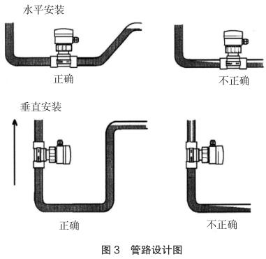 現(xiàn)場安裝時(shí)應(yīng)注意遠(yuǎn)離可能對其產(chǎn)生干擾的大型設(shè)備,防止長期的熱輻射和其他如磁場直射等環(huán)境影響。為確保高測量精度和較好的零點(diǎn)穩(wěn)定性,進(jìn)行校正前,高壓電磁流量計(jì)應(yīng)裝入工藝介質(zhì)中至少 24 小時(shí)電極鈍化。安裝的管路設(shè)計(jì)應(yīng)確保管道始終充滿流體,防止測量誤差,管路設(shè)計(jì)圖見圖 3。