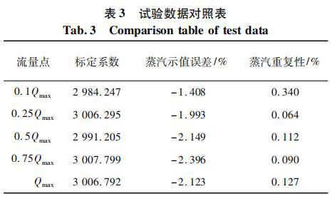 測試對象為同一臺表,DN80 口徑,帶有在空氣標(biāo)定裝置上的 5 點(diǎn)標(biāo)定系數(shù)。將管道介質(zhì)設(shè)定為過熱蒸汽,并預(yù)設(shè)溫度為 160 ℃ 和壓力 0. 4 MPa,以便儀表計算過熱蒸汽的密度。試驗數(shù)據(jù)對照如表 3 所示。