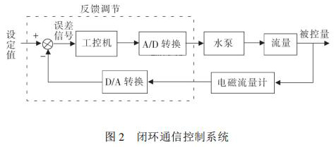 通信控制系統(tǒng)由工控機(jī)、變頻器、水泵、數(shù)據(jù)采集卡、煤油流量計(jì)等組成。在整個(gè)熱量表耐久性試驗(yàn)裝置中,煤油流量計(jì)與被試驗(yàn)熱量表串聯(lián)在試驗(yàn)管路中。系統(tǒng)設(shè)定流量值 qs,通過工控機(jī)發(fā)送信號(hào)給變頻器,來控制水泵運(yùn)轉(zhuǎn),系統(tǒng)通過研華數(shù)據(jù)采集卡 PCI1711 將采集到的煤油流量計(jì)當(dāng)前瞬時(shí)流量值反饋給工控機(jī),工控機(jī)將返回流量值與設(shè)定流量值qs進(jìn)行比較,從而確定是否需要重新調(diào)整變頻器頻率控制水泵轉(zhuǎn)速。此過程是一個(gè)完整的閉環(huán) PID 控制過程,其閉環(huán)控制過程如圖 2 所示。 2. 2 管路切換系統(tǒng)管路切換主要由冷熱水箱、水泵、開關(guān)閥等組成。要實(shí)現(xiàn)熱量表耐久性 4000 次冷熱沖擊試驗(yàn),需要實(shí)時(shí)控制管路中熱水與冷水的交替使用。