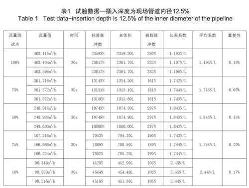 氣體渦輪流量計(jì)插入深度為現(xiàn)場(chǎng)管道內(nèi)徑的 12.5%時(shí),試驗(yàn)數(shù)據(jù)如下(以 DN200 為例):