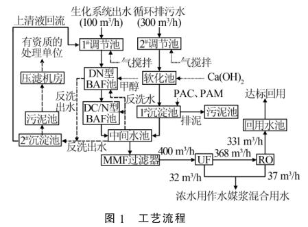 2種廢水在中間水池混勻后,通過泵提升進(jìn)入保安過濾器,進(jìn)一步去除細(xì)小的懸浮物后經(jīng)過增壓泵進(jìn)入超濾膜(UF)處理系統(tǒng)和反滲透(RO)系統(tǒng),然后通過渦輪流量計進(jìn)行計量。反滲透出水直接進(jìn)入回用水池達(dá)標(biāo)回用,超濾濃水以及反滲透濃水用作水煤漿混合用水。污泥池中的污泥通過泵打入帶式機(jī)壓濾處理,濾液自流進(jìn)入1#調(diào)節(jié)池。工藝流程見圖1。