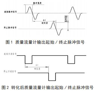將高壓電磁流量計(jì)流量與相關(guān)測(cè)試設(shè)備連接起來(lái),就可以進(jìn)行高壓電磁流量計(jì)的校準(zhǔn),時(shí)間差△ t 由專用試驗(yàn)測(cè)試設(shè)備可以測(cè)出。起始脈沖信號(hào)和終止脈沖信號(hào)如圖 1 所示。經(jīng)過(guò)專用試驗(yàn)測(cè)試設(shè)備信號(hào)轉(zhuǎn)化后的信號(hào)方波如圖 2 所示。