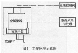 本裝置采用容積法和稱重法相結(jié)合的工作原理。對(duì)于質(zhì)量流量計(jì),采用稱量法直接比較,確定流量計(jì)的誤差。上裝放油閥防溢出控制系統(tǒng),采用液位動(dòng)態(tài)監(jiān)視,一旦超過(guò)容器安全液位高度,即可切斷發(fā)油動(dòng)力。在運(yùn)輸防震或非測(cè)量狀態(tài)時(shí),對(duì)秤進(jìn)行與稱重容器的脫離操作,保證稱重的可靠性。在稱重狀態(tài)時(shí),需要對(duì)枰進(jìn)行調(diào)平和清零,此部分采用動(dòng)態(tài)水平的方式進(jìn)行,即以水平位一致的方法調(diào)整稱重平臺(tái)。工作原理如圖1所示。