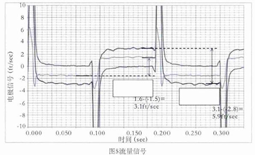 舉例,如圖5所示,線圈采用5Hz驅(qū)動時的0feet/s,3.1feet/s,5.9feet/s流速下的電極信號,利用上述方法對信號進行處理并計算流速。取每半波*后的20%納入流速計算,正半波與負(fù)半波相減即是流速。如3.1feet/s–(-2.8feet/s)=5.9feet/s,雖然有+0.15 feet/s的直流偏置,但也不影響流速的計算。因線圈是5Hz驅(qū)動,半波的20%是20ms,正好是1個完整的工頻周期,這樣就不受工頻干擾的影響。正半波與負(fù)半波相減,這樣就避免了直流偏置和共模干擾的影響。再加上在數(shù)字濾波過程中使用限幅濾波和算數(shù)平均,保證了流量信號的有效提取。