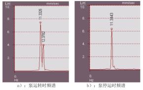對(duì)振動(dòng)采集器獲取的信號(hào)進(jìn)行譜分析,超聲波污水流量計(jì)組運(yùn)轉(zhuǎn)狀態(tài)下主要振動(dòng)頻率為11.33Hz和12.38Hz,其中12.38Hz為液體流量計(jì)轉(zhuǎn)動(dòng)頻率;停運(yùn)時(shí),12.38Hz的液體流量計(jì)轉(zhuǎn)頻消失,11.33Hz的外部激擾力依然存在。