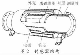 電磁流量計(jì)由流量傳感器和轉(zhuǎn)換器兩部分組成。傳感器典型結(jié)構(gòu)示意如圖2,測量管上下裝有激磁線圈,通激磁電流后產(chǎn)生磁場穿過測量管,一對電極裝在測量管內(nèi)壁與液體相接觸,引出感應(yīng)電勢,送到轉(zhuǎn)換器。激磁電流則由轉(zhuǎn)換器提供。