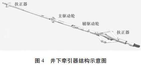 水平井注水井注入剖面測井工藝原理如圖 3 所示。在垂直井段,儀器在重力作用下可以通過注入管柱下入到井內(nèi),注入管柱下端須裝有喇叭口,且喇叭口應在造斜點以上,保證測井完成后儀器順利起出,不發(fā)生卡儀器問題。儀器通過喇叭口以后在重力作用下繼續(xù)向下移動,當儀器不能靠重力下移時,啟動牽引器,利用牽引器將儀器推送到井底,上提電纜過程中進行測井。