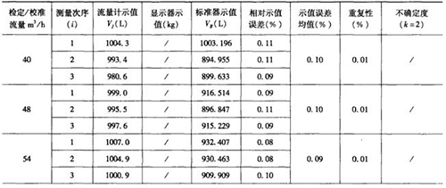 表1是用容積法現(xiàn)場檢測流量計(jì)后,電腦自動(dòng)生成的原始記錄數(shù)據(jù)頁部分,表2是用質(zhì)量法現(xiàn)場檢測流量計(jì)后,電腦自動(dòng)生成的原始記錄數(shù)據(jù)頁部分。