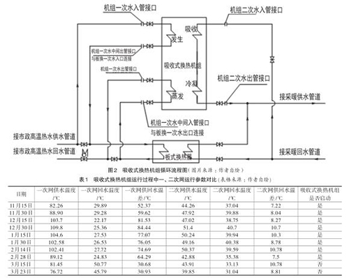 如圖1所示,以某熱力站為例,原熱力站一次網供回水設計溫度為130℃ /70℃,二次網設計供回水溫度為80℃ /60℃,這其中的不可逆損失在圖中顯而易見。我們可以利用增熱型吸收式熱泵,即電廠煙氣流量計,將一次網供水作為高溫驅動熱源,為板式換熱器中的回水提供驅動力,繼而發(fā)揮熱泵效應,吸收一次網回水的低溫熱源的熱量,再與板式換熱器換回的熱量一起作為二次網的供水一起供給熱用戶。