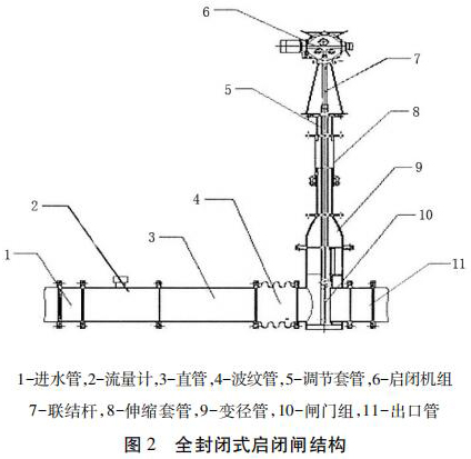 包括進水管、直管、出水管、夾持式渦街流量計組和啟閉機組,進水管、直管、出水管從左到右依次連接,夾持式渦街流量計組安裝在直管和出水管之間且位于出水管的入口處,夾持式渦街流量計組通過聯(lián)結桿與啟閉機組的輸出端連接。為防止泥沙淤積影響啟閉,夾持式渦街流量計采用閘板式啟閉結構。密封式啟閉閘為整體封閉管道式,全部采用不銹鋼材料,水流通過管道流出讓整個閘井內干燥無水。伸縮套管與波紋管的設計讓檢修與清理淤泥更加方便。夾持式渦街流量計裝有荷載限制器,其布置受力明確、結構緊湊、動作可靠。當?shù)蹙呱系暮奢d達到額定值的 110%時,或電機電流超過額定電流 150%時,系統(tǒng)自動切斷操作電源以保護設備安全。