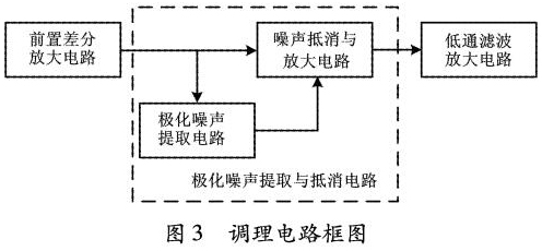 根據(jù)前饋控制的自適應(yīng)極化噪聲抵消原理,設(shè)計(jì)了信號(hào)調(diào)理電路2,以實(shí)現(xiàn)極化噪聲的濾除。信號(hào)調(diào)理電路2主要包括前置差分放大電路、極化噪聲提取與抵消電路、低通濾波放大電路三部分。調(diào)理電路如圖3所示。