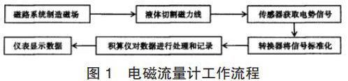智能渦輪流量計的產(chǎn)生主要是基于法拉*電磁感應(yīng)定律。在智能渦輪流量計的應(yīng)用中,磁路系統(tǒng)會在流量計運(yùn)行過程中逐步出現(xiàn)直流磁場與交流磁場,該磁場的產(chǎn)生為后期的測量提供了良好的前提條件,營造了測量所需的磁場環(huán)境,因此,在智能渦輪流量計應(yīng)用時,一旦被測液體在導(dǎo)管中經(jīng)過該磁場環(huán)境時,必然會產(chǎn)生一定的切割磁力線運(yùn)動,在這種情況下,電極傳感器就會發(fā)揮其作用,將導(dǎo)管內(nèi)的流量轉(zhuǎn)換為感應(yīng)電勢信號,隨后此轉(zhuǎn)換形成的信號逐步被傳遞給轉(zhuǎn)換器。而轉(zhuǎn)換器更是可以將所獲得的流量信號等加以處理,通過分析、對比等,轉(zhuǎn)換器會將該信號變?yōu)闃?biāo)準(zhǔn)信號,隨后將該信號輸出給積算儀,進(jìn)一步進(jìn)行信號的處理,這些處理以后的信號*終會在智能渦輪流量計的儀表中顯示,呈現(xiàn)*終的流量測量結(jié)果,其基本的流程如圖 1 所示。