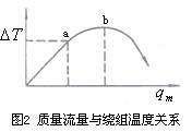 在總的熱傳導系數(shù)a中,因測量管壁很薄且具有相對較高熱導率,儀表制成后其值不變,因此a的變化可簡化認為主要是流體邊界層熱導率的變化。當使用于某一特定范圍的流體時,則a、cp均視為常量,則質量流量僅與繞組平均溫度差成正比,如圖2 oa 段所示。 oa段為儀表正常測量范圍,儀表出口處流體不帶走熱量,或者說帶走熱量極微;超過a點流量增大到有部分熱量被帶走而呈現(xiàn)非線性,流量超過b點則大量熱量被帶走。