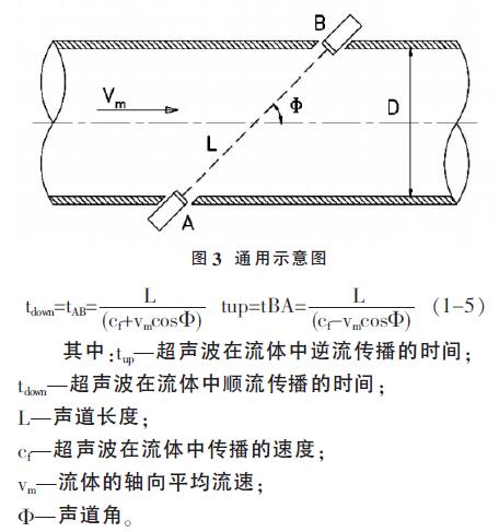 2、超聲流量計以測量超聲波在流動介質(zhì)中傳播的時間與流量的關(guān)系為原理。通常認(rèn)為超聲波在流體中的實(shí)際傳播速度是由介質(zhì)靜止?fàn)顟B(tài)下超聲波的傳播速度cf和流體軸向平均流速vm在超聲波傳播方向上的分量組成。如圖,順流和逆流傳播時間與各量之間的關(guān)系是