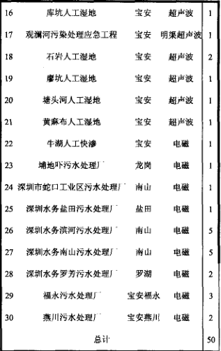 截止目前,深圳市內(nèi)外所有污水處理廠(包括人工濕地、快滲)共計(jì)30余座,重點(diǎn)監(jiān)控的排污流量計(jì)50余臺(tái)。統(tǒng)計(jì)數(shù)據(jù)如下表(見(jiàn)表1)